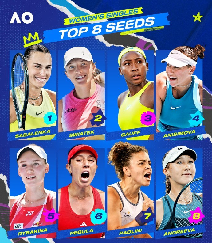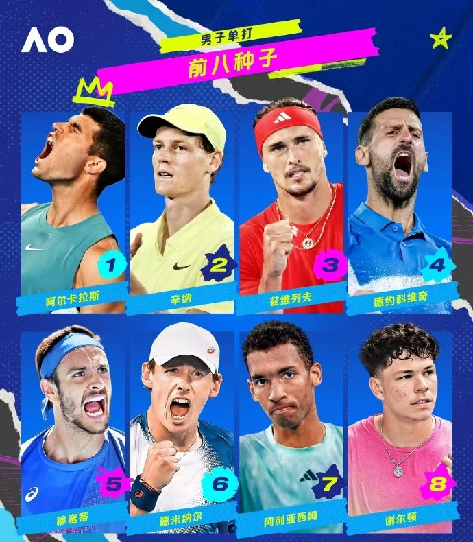 另外,北京时间昨天,2026澳网官宣了男女单打种子球员名单。男单方面,前八号种子分别是:1. 阿尔卡拉斯2. 辛纳3. 兹维列夫4. 德约科维奇5. 穆塞蒂6.德米纳尔7. 阿利亚西姆8. 谢尔顿