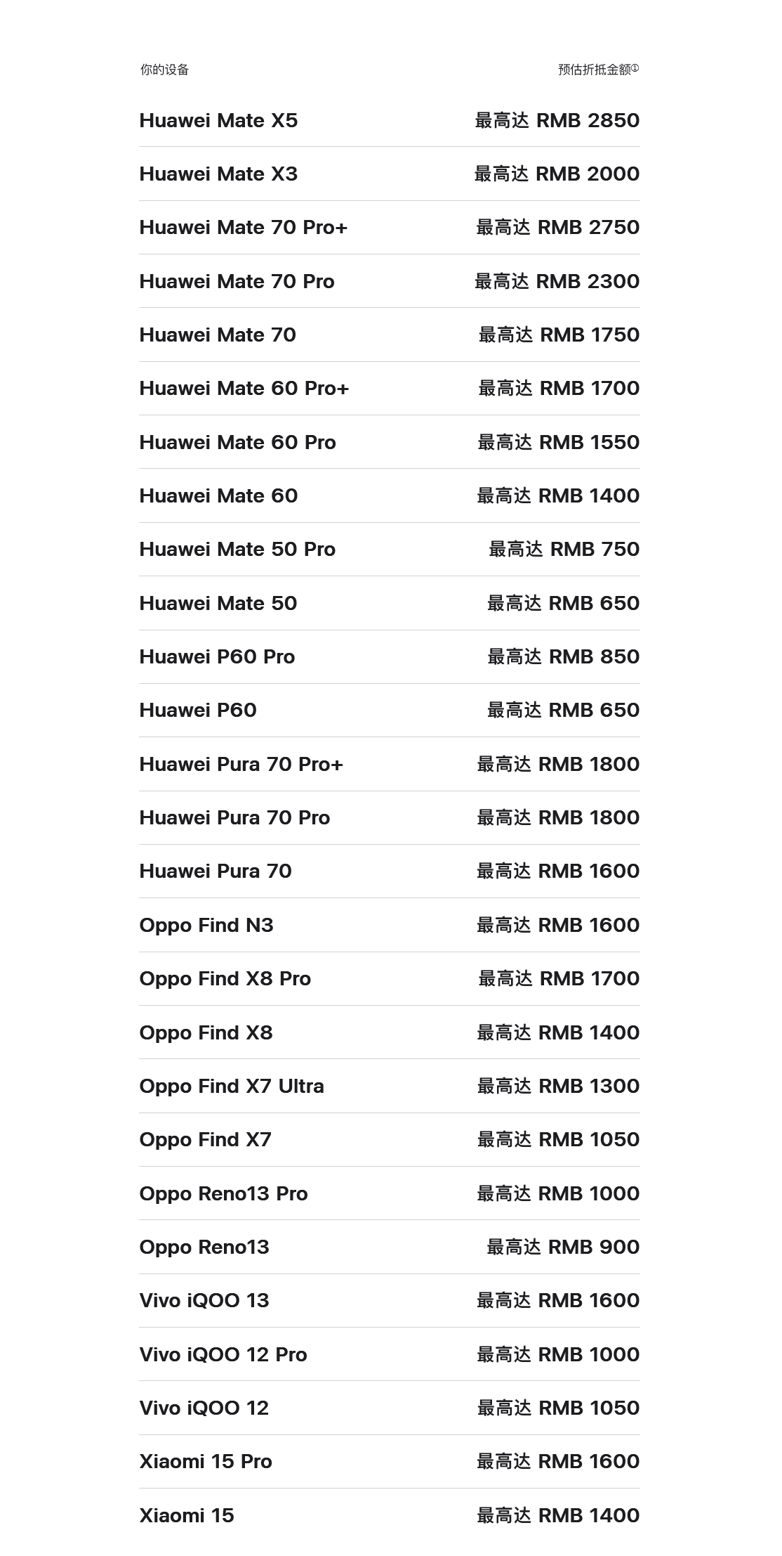 苹果“Trade in”活九游娱乐官网动界面显示,Huawei Mate 70 Pro+最高可抵2750元,Huawei Pura 70 Pro最高可抵1800元;OPPO Find X8 Pro最高可抵1700元;Xiaomi 15 P九游娱乐官网ro最高可抵1600元;vivo iQOO 13最高可抵1600元。